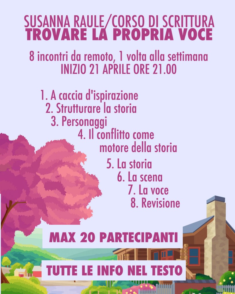 Un corso di scrittura, che poi un corso di scrittura non è. Non mi sono mai sentita a mio agio con l’idea di insegnare qualcosa a qualcuno, un po’ per un’innata sensazione di inadeguatezza, un po’ perché ho paura di influenzare la scrittura altrui, di intrappolarla in regole che hanno sempre eccezioni. Mi è capitato spesso di trovarmi a parlare con giovani autori così legati ai paletti dei corsi di scrittura da esserne quasi intrappolati.